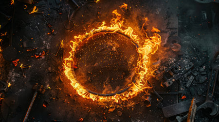 ring of fire surrounded by metal tools or machinery parts