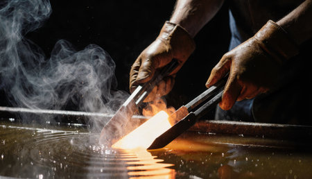Skilled hands expertly manipulate glowing metal, creating intricate forms while steam rises. The atmosphere is filled with the heat and intensity of craftsmanship under low light.