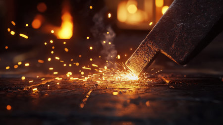 A vivid close-up of a hot metal piece being forged in a traditional blacksmith workshop, showcasing vibrant sparks and intense heat interaction.