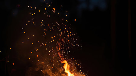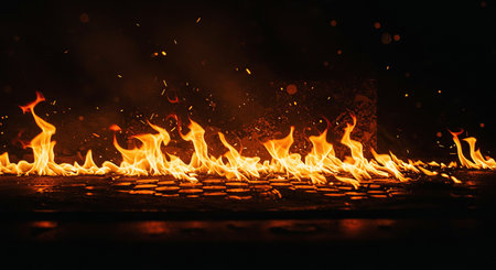 AI Generated. Bright flames dance above glowing embers in a dark setting during a nighttime display of fire