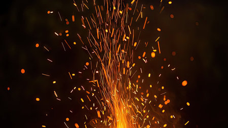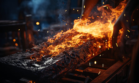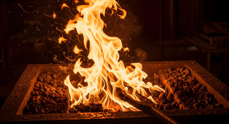 A captivating image showcasing bright flames and flying sparks from a charcoal bed in an artisan forge, illustrating the intense heat and craftsmanship of blacksmithing.