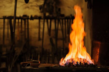 Close-up of traditional blacksmith’s forge, hot flames and coal