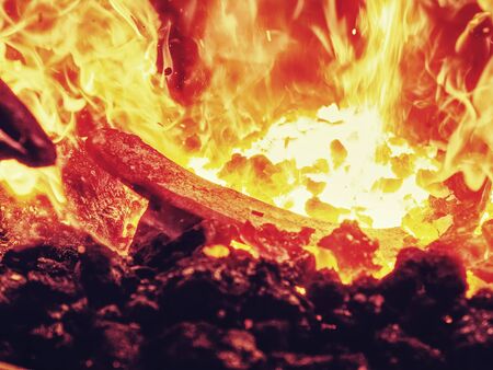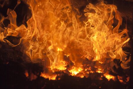 Abstract background of glowing coals in fireplace with fire flames. Burning flame background
