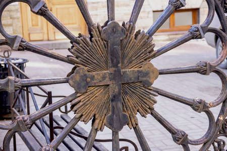 St. Petersburg, Russia - March, 03, 2021: Cross on the gate of the Lutheran Church of Saints Peter and Paul in St. Petersburg.