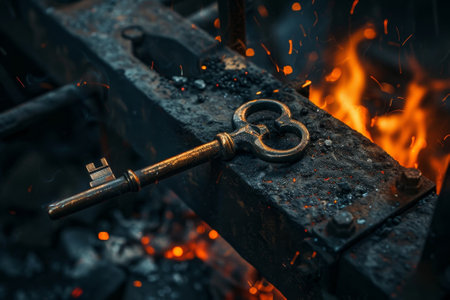 A key is sitting on a metal surface with a lot of black and orange sparks. The key is old and rusted, and the sparks suggest that it has been used recently. Scene is one of nostalgia and history