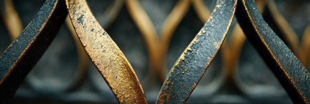 Artistic macro photograph highlighting intricate rust patterns on metal bars. The image captures the texture and decay in a dark, minimalist environment, emphasizing aging.