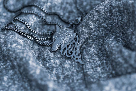 Pendant wolf head necklace black color shoot outside in a sunny day closeup. Selective Focus