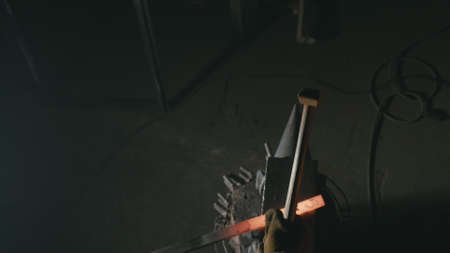 Forge workshop. Smithy manual production. Hands of smith with hammer hit on glowing hot metal, on the anvil, the forging process.