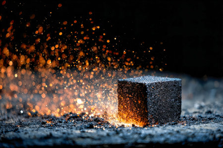 A dramatic close-up image of a blacksmith's hammer striking an anvil, sending vibrant sparks flying in an evocative workshop setting.
