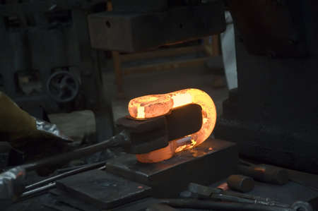 Making of horseshoe. Male worker with hammer making nail holes on horseshoe.