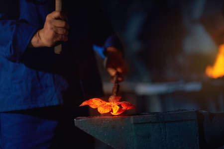 Close-up working powerful hands of male blacksmith forge an iron product in a blacksmith. Hammer, red hot metal and anvil. Concept of labor, retro professions