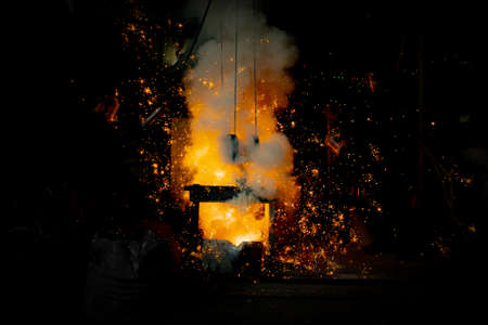 The work of the foundry. Pouring hot metal from the bucket into molds. Bright red metal, smoke and sparks flying to the sides