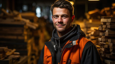 A handsome male worker stands in uniform against a background of construction materials.