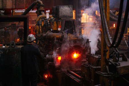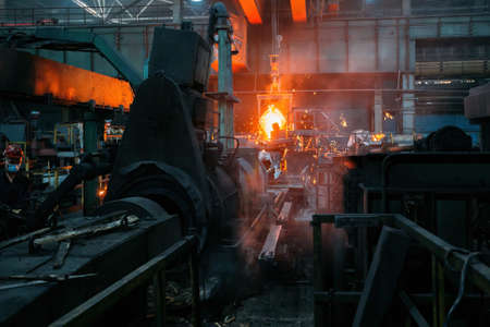 Worker swings large hammer in workshop of metallurgical plant.