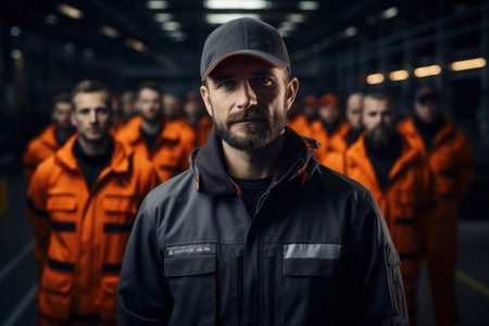 Portrait of a group of workers in a factory smiling and looking at the camera, group of smiling construction workers wearing uniforms, AI Generated