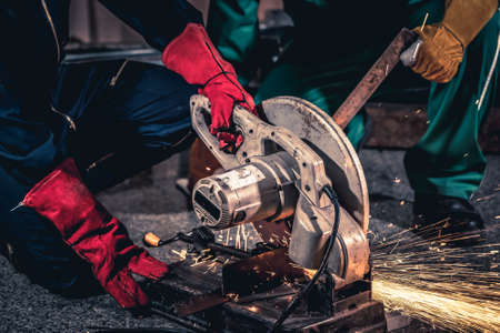 Professional mechanic man is cutting steel metal with rotating carbon blade cutter. Steel industry and workshop concept.