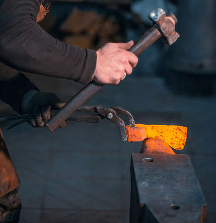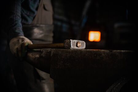 The blacksmith manually forging the red-hot metal on the anvil in smithy. hard work. energy and power. Concept of labor, retro professions