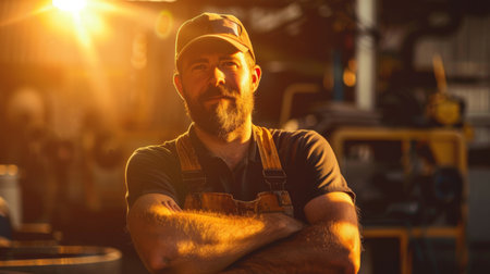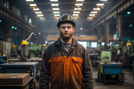A male worker stands in a workshop against an industrial background. Realistic photography.