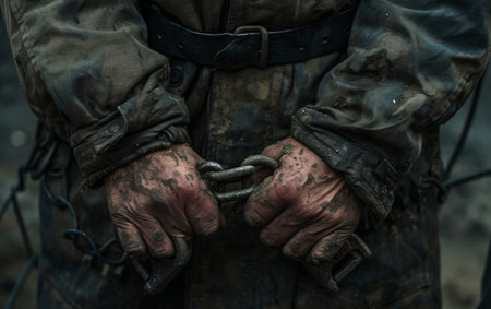 Close-up of dirty, worked hands gripping a heavy chain, wearing worn, stained clothing
