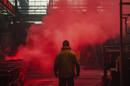 A solitary figure stands in a dimly lit factory, engulfed in swirling red smoke. The contrast between shadows and vibrant hues creates a captivating, mysterious ambiance, suggesting industrial power.