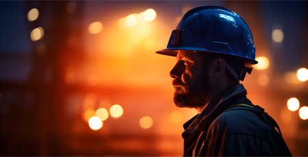 Caucasian industrial worker with safety helmet at night. Concept of safety measures, skilled labour and workforce.
