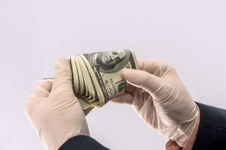 Two hands holding or gives US dollar in medical gloves for protect, quarantine period covid19