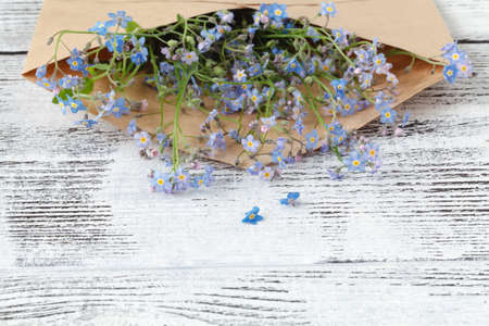 envelope with flowers forget-me-nots on wooden background