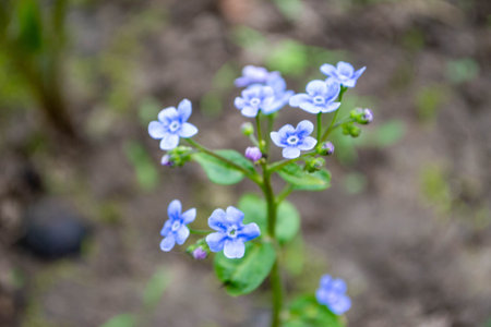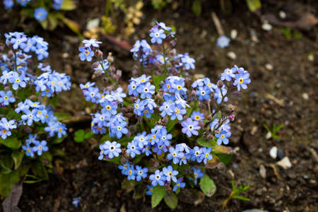 spring forget-me-not flowers grow in bush on black earth.