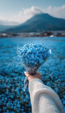 A hand holds a bouquet of blue flowers, presented against a backdrop of a mountain. The image features soft focus and a color palette dominated by blues. This scene suggests an outdoor setting, potentially a field or garden. Suitable for various editorial and commercial applications.