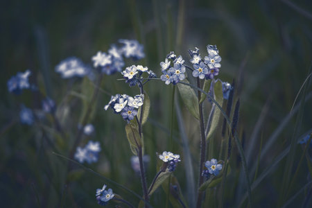 Wood Forget-me-not (Myosotis sylvatica) flowers in the meadow. Selective focus and shallow depth of field.