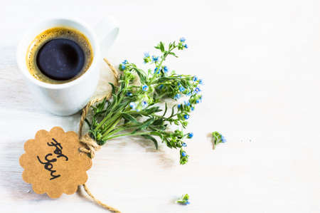 Forget-me-not spring flowers and cup of coffee on wooden rustic background