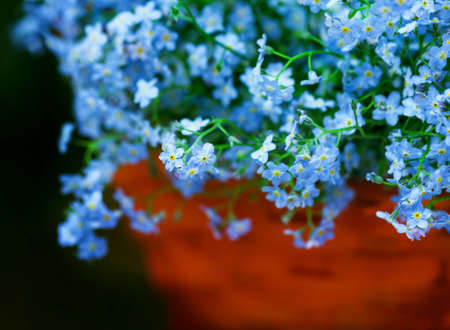 Pretty delicate forget-me-nots in orange basket on dark background