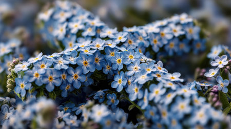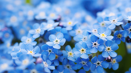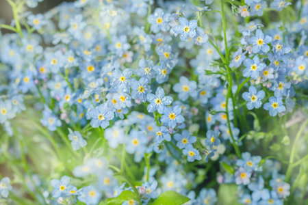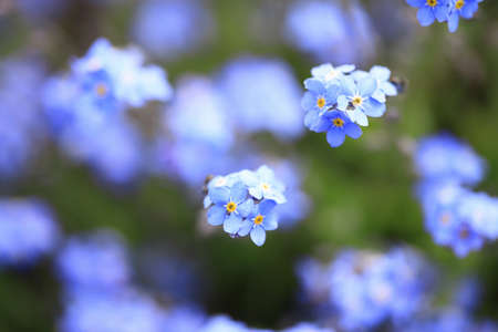 Forget-me-not flowers background. Blue florets in bloom on sunny day. Symbol of true love