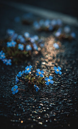 This image showcases small blue flowers emerging from a textured, dark surface. The composition focuses on the flowers with a blurred background and soft lighting. The scene evokes a sense of natural beauty and peacefulness. It could be suitable for various commercial projects or editorial content.
