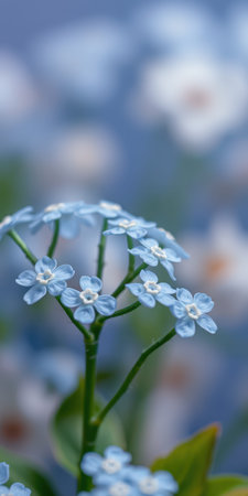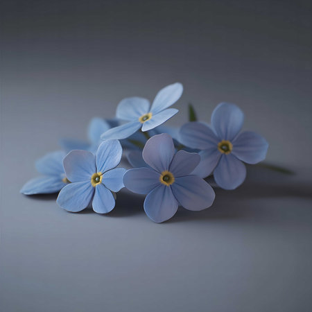 Close-up of delicate blue forget-me-not flowers, showing their soft petals and serene beauty. Studio shot.