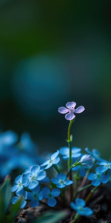 Delicate blue flowers bloom in a serene garden, surrounded by soft hues of nature during springtime