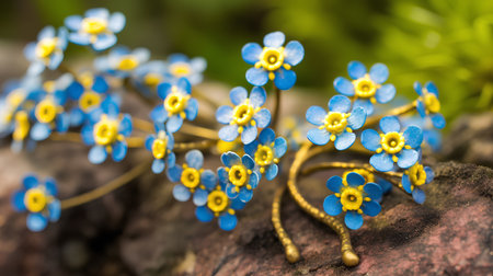 macro delicate beauty of forget-me-not flowers with their vivid blue petals and bright yellow centers, adorned with pristine dew drops against a lush green background