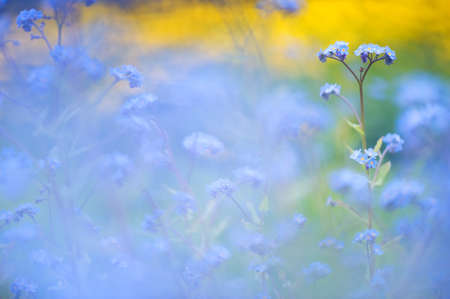 Forget-me-not flowers in the meadow at sunset