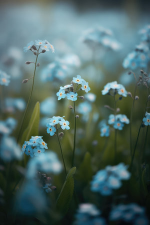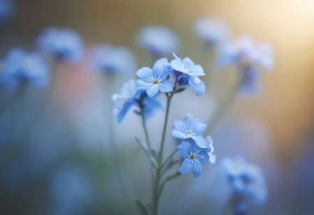A field of vibrant blue forget-me-not flowers bloom in a sun-drenched meadow, bathed in the warm glow of the setting sun. The flowers stand tall and proud, their delicate petals catching the light, creating a beautiful and enchanting scene.