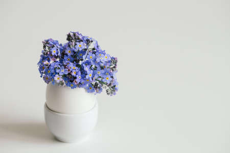 Bouquet of blue forget-me-not flowers in a cracked egg on a white background. Easter minimal concept. copyspace.