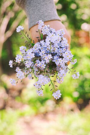 Person holds forget me not flowers in her hand. Close up.