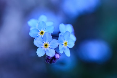 Forget-me-not, Myosotis, flowers blooming in darkness bokeh side view