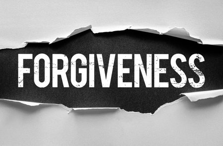 The word Forgiveness in distressed white font is revealed beneath torn paper on a dark background. Conceptual image representing healing, acceptance, emotional release, and reconciliation