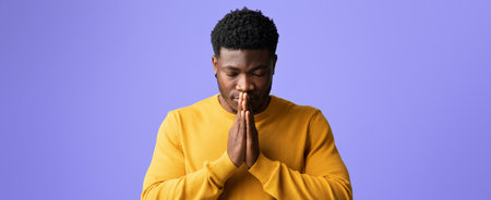 Man With Closed Eyes and Hands Together in Front of Purple Background During Reflective Moment