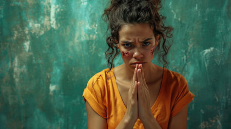 I'm afraid. Portrait of a frightened and scared young woman with a bruise or abrasion on the face, on a pastel dark green background beggin