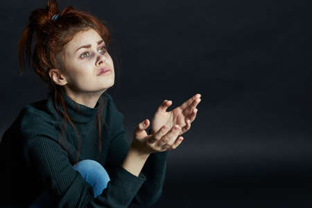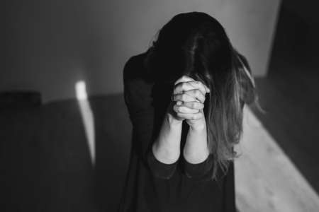 Woman Overcome with Sadness and Grief on a Dark Studio Background