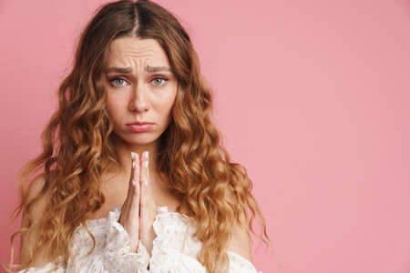 Please, Im begging forgive. Adorable upset worried woman of young age with wavy hair looking with imploring desperate grimace, praying for help. Indoor studio shot isolated on gray background.