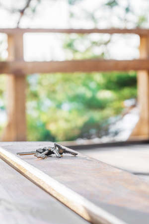 Some door keys aligned on old wooden surface, safety and security concept background.