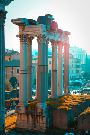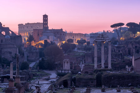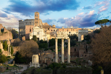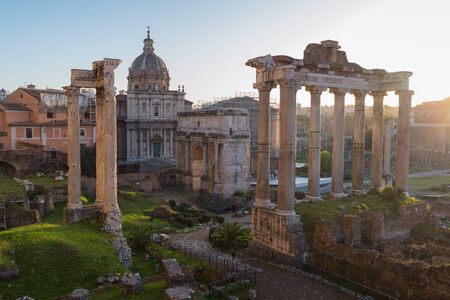 Roman Forum in Rome, Italy. Antique structures with columns. Wrecks of ancient italian roman town. Sunrise above famous architectural landmark.