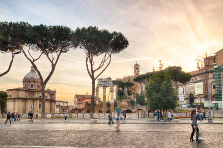 The ancient ruins of the Roman Forum and Palatine hill. Old road. Rome, Italy.